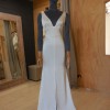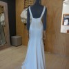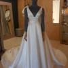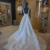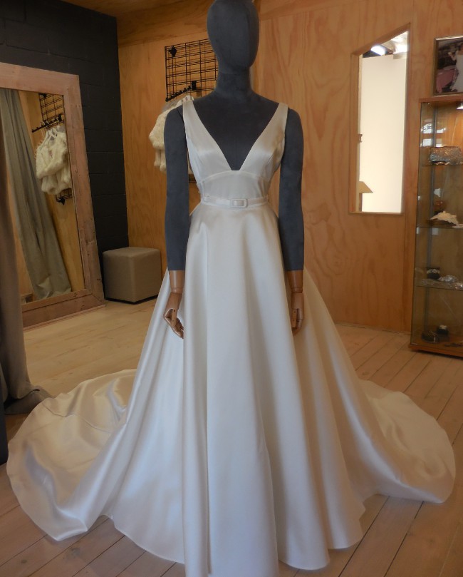 Bridal gown is an elegant satin gown with deep V neckline, low back with button detailing and centre front split. The overskirt is a full silk twill skirt with two metre train. The dress also comes with a thin, silk belt for added detail.