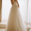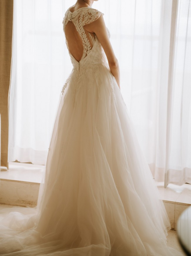 “Get ready for a romantic walk down the aisle in this dreamy beaded A-line tulle dress featuring two types of lace appliques on the bodice, long sleeves, and a beautiful open back.”