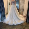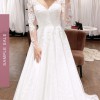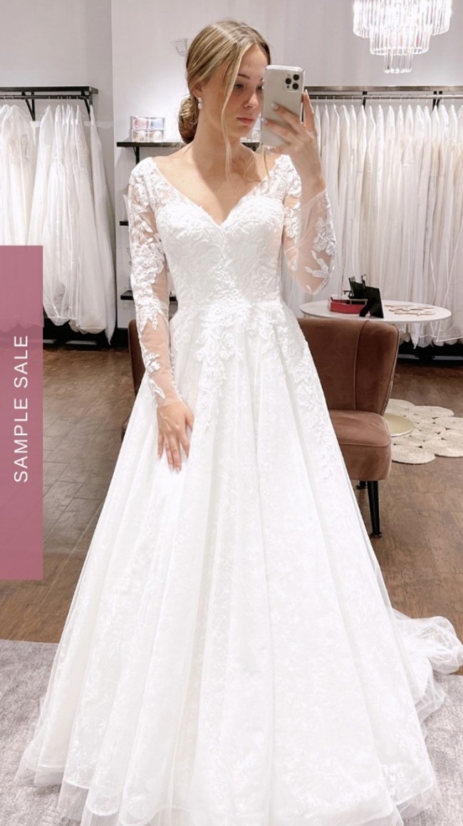 This dress is a long sleeve floral lace dress. The solid ivory part of the dress is sweetheart shaped but the see through lace goes over the shoulder. I’m very slim and got married at 100 pounds, I got it altered to fit a size 0. It’s the most beautiful dress I personally have ever seen (but what bride doesn’t think that about their dress;) ). It was worth every penny I spent on it, which was $2,083.26.