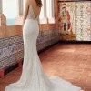 Beautiful crochet style lace with a chevron pattern and sweep train is embellished with sequin and sparkle detailing throughout.