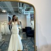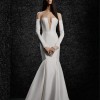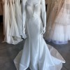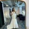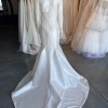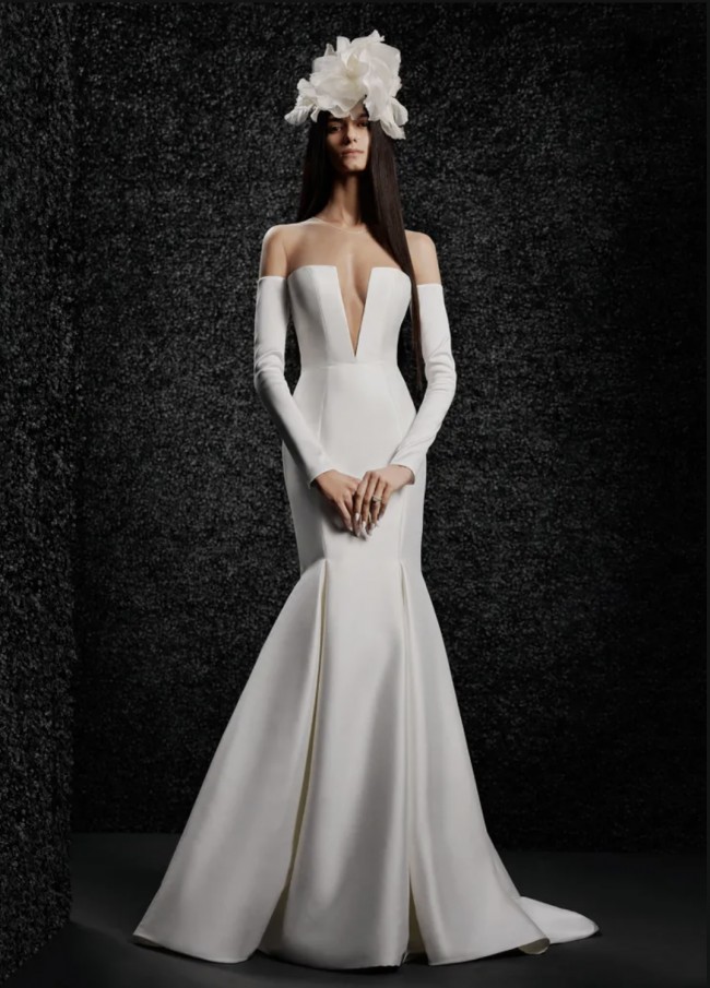 Off-white mikado dress. Strapless. A smooth mermaid gown with dramatic features. A pointed plunge bodice anchors a fishtail skirt cut with box pleats for added volume. . A smooth mermaid gown with dramatic features. A pointed plunge bodice anchors a fishtail skirt cut with box pleats for added volume. **Sleeves are unavailable with this gown.