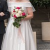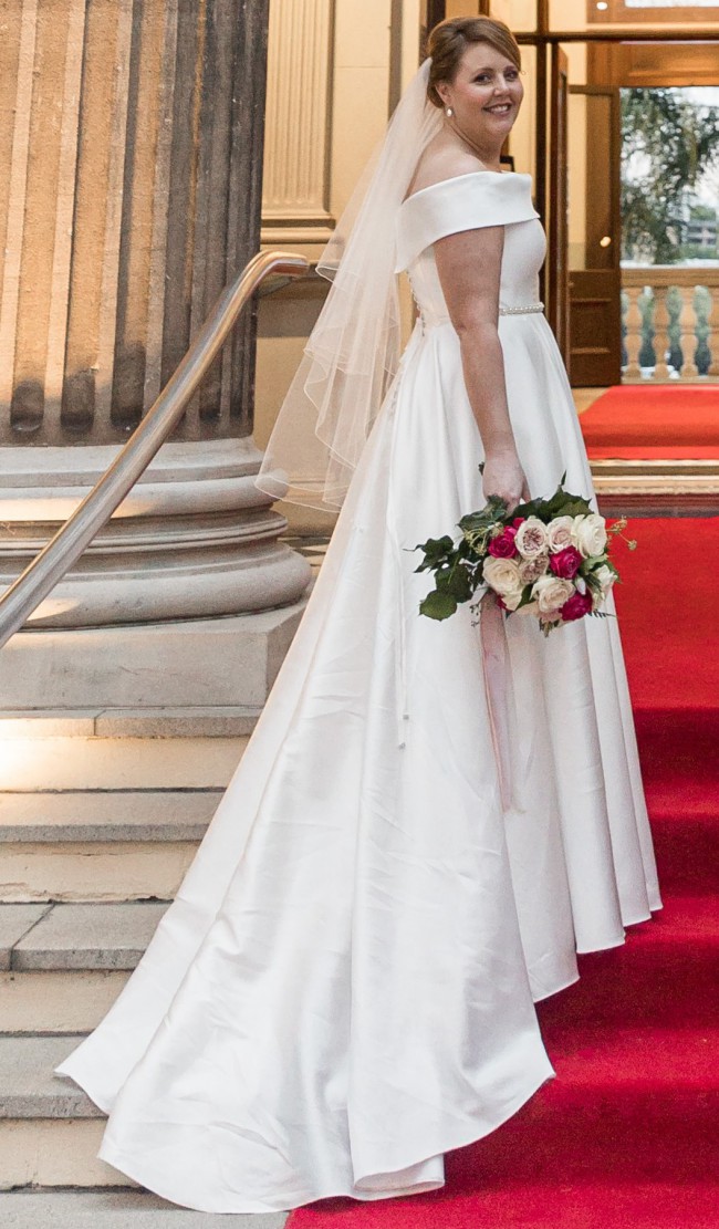 This stunning dress is from Paddington Weddings (label is Bertossi Brides) and is a textured silk fabric which will make you feel amazing on your special day. The dress is classy, elegant & comfortable (don't need to wear a bra with it). I am a size 14 and was custom made to my measurements. I am also selling the veil with the dress but not the belt that is pictured in the photos.