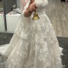 Crafted with eleven different types of lace and 4,500 hand-beaded embellishments, this wedding dress is fit for royalty. Sequin appliques, pearl-beaded cross-back spaghetti straps, and a multi-layer tulle skirt lends subtle sparkling detail to the look. Complete with a chapel train.