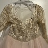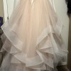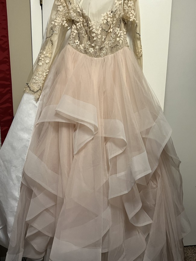 Blush colored Hayley Paige Lorelei dress. Never worn. Bought the dress from another bride who decided to elope and never altered or wore the dress. Dress kept in dress bag from retailer. Has sweetheart neck with sheer extending up to the neck with beading present and sheer long sleeves. I was 1/2 inch from zipping so my seamstress added a corset in the zipper. No fabric was removed or added from original dress. No damage present or missing stones or beads. Dress is backless. Corset as pictured. I’ve kept it in the bag. Photos do not do this dress justice.