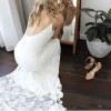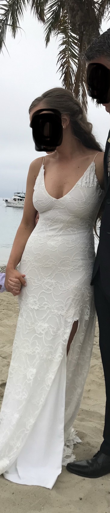 Gorgeous Grace Loves Lace "Lottie" - size medium. I'm normally a size 6 in dresses, 32D bust, and 6'0" with heels. The fabric has decent stretch and I was able to wear without a bra comfortably. The dress is a sheath silhouette but gently flares out during movement. It also has a sweep train of sheer lace. I felt absolutely beautiful in this dress - it’s the perfect amount of simple and sexy. Worn for a beach wedding in Summer 2021 and professionally cleaned after.