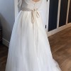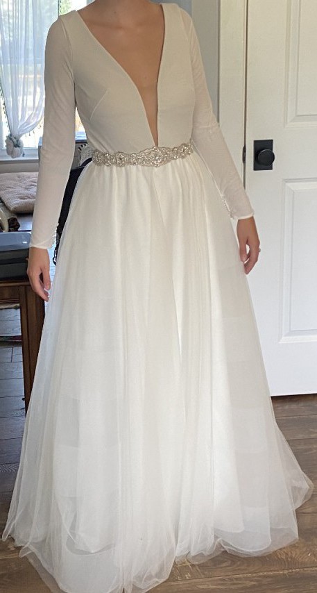 Beautiful tulle dress purchased on 7/22/23 from a local bridal boutique. Very light and breathable, with soft mesh sleeves. Worn only for the photos featured. Selling because I realized our renewal is not going to be as formal as I had originally thought. Belt included!