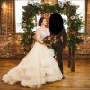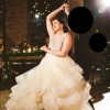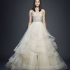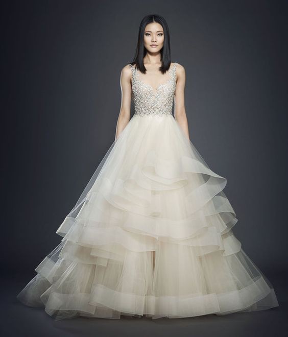 Champagne tulle bridal ball gown, sheer nude net at neckline, sweetheart jewel encrusted bodice, natural waist, layered horsehair tulle skirt, chapel train.