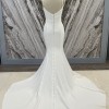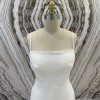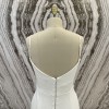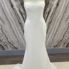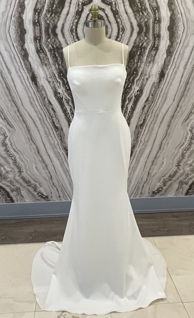 Fashion forward column style square neck wedding dress with a subtle v shape back. Features sleek spaghetti straps and a long train with Belle Contour Crepe fabric and covered buttons running all the way down.