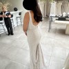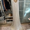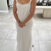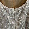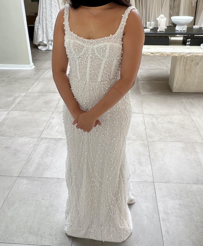 This Dana Harel Jules Gown is a custom-fitted corset dress with a square neckline that is covered with hand-beaded pearl embroidery over the whole dress. The dress is three layers - a mesh liner, a net layer with delicate grey sequins, and a net layer with white pearls.