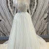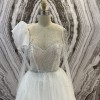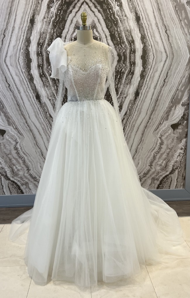 Soft Tulle and beaded A-line dress featuring an embellished long sleeve and illusion neckline. In the previous year collection this gown was called Marion.