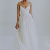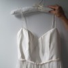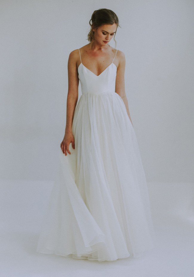 New with tags, never worn, never altered Laurel by Leanne Marshall. Customized to light ivory (closer to white than their usual ivory) and to have a silk chiffon skirt—the Laurel usually has a stiffer organza skirt. Basque waist, delicate straps, easy to store and travel with because the silk is so resilient! Original length so can be tailored to most brides. The bodice is fitted but this dress's flowy skirt has a more flexible hip measurement range, and backless upper bodice would be easy to take in or out. No defects, no imperfections. I am usually a street size 6 and 5'1'" but the dress was never hemmed and would fit much taller brides.