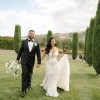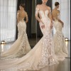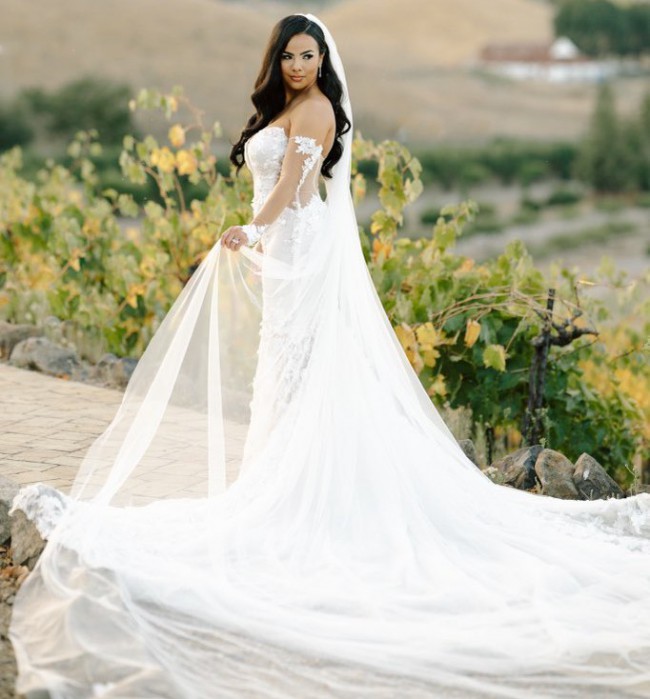 This form-fitting mermaid gown, made of 3D sparkly lace, features a cinched waist corset top and a dramatic cutout that continues to the back with a dramatic semi-sheer train. Nadia also includes glamorous and embellished off-the-shoulder gloves.