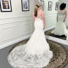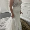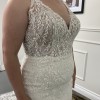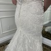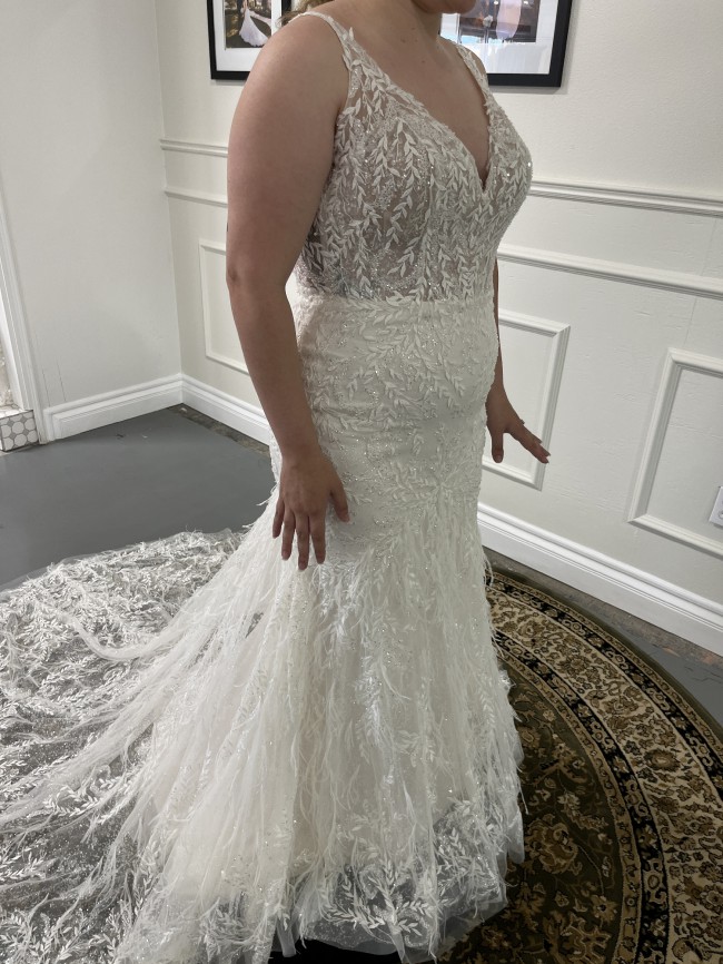 Beautiful dress with unique details. Vine embroidery consistent throughout the gown with feathers that start near knee level and follow down the the train.