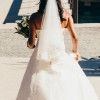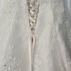 White sweetheart shaped neckline, floor length set in a corset style with criss cross laced back. Comes with a veil.