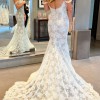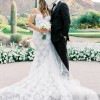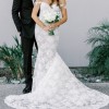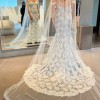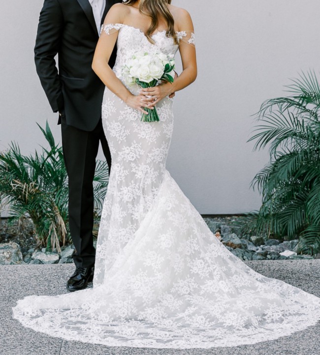 Trumpet lace corset Eve gown with removable sleeves. Monique Lhuillier “Kirsten” cathedral length veil included. Dress has an English bustle which you can see in the black and white dancing photo. This dress has a nude colored liner with ivory lace over it and the veil is also ivory! Gown was purchased at Monique Lhuillier’s flagship store in Los Angeles and retails for $8,500 (veil $690). Worn at my October 2023 wedding.