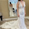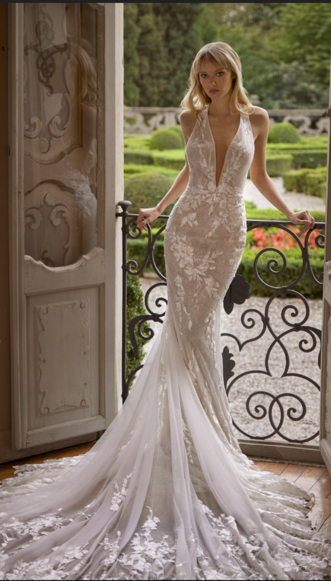 NWT BRAND NEW NEVER ALTERED NEVER WORN! This Amethyst wedding dress by renowned designer Ines Di Santo is the epitome of elegance and sophistication. Crafted in a stunning ivory lace, this beautiful gown embraces your figure with a flattering trumpet silhouette that promises to accentuate your curves while providing a timeless look. The intricate beading and embroidery add a touch of sparkle, ensuring you shine on your special day.