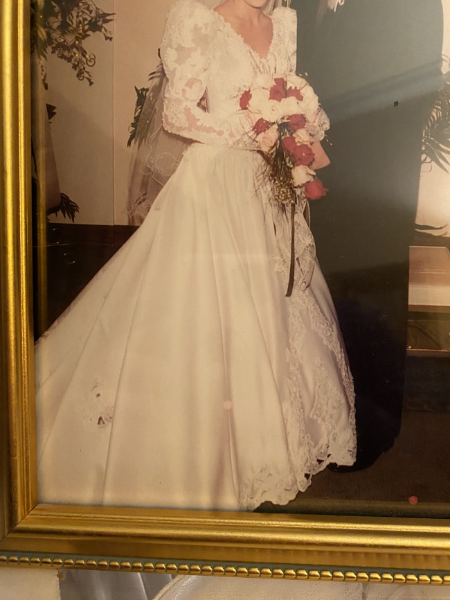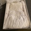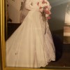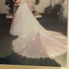 Beautiful wedding dress, has been sealed until today for pictures and to verify the size. It was dry cleaned and sealed and will be shipped in the box. No flaws, wore for my wedding in February of 2000. It fits well, has a beautiful train and veil and an option to hook the train to the wedding dress for reception purposes.