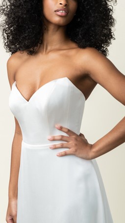 Incredibly flattering with its corset, beautiful button-up low back and A-line skirt, this dress is strapless There is a hook and eye system inside the corset, which is covered by the buttons, so you feel incredibly secure - no bra needed!
