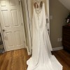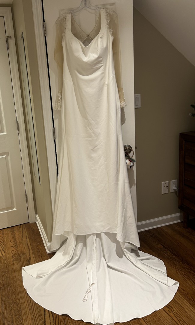 Sheer sleeves and back with buttons down to the bottom of the train. Beautiful beading detail on the shoulders, bell sleeves and the back. Extremely comfortable (tried on a sample)