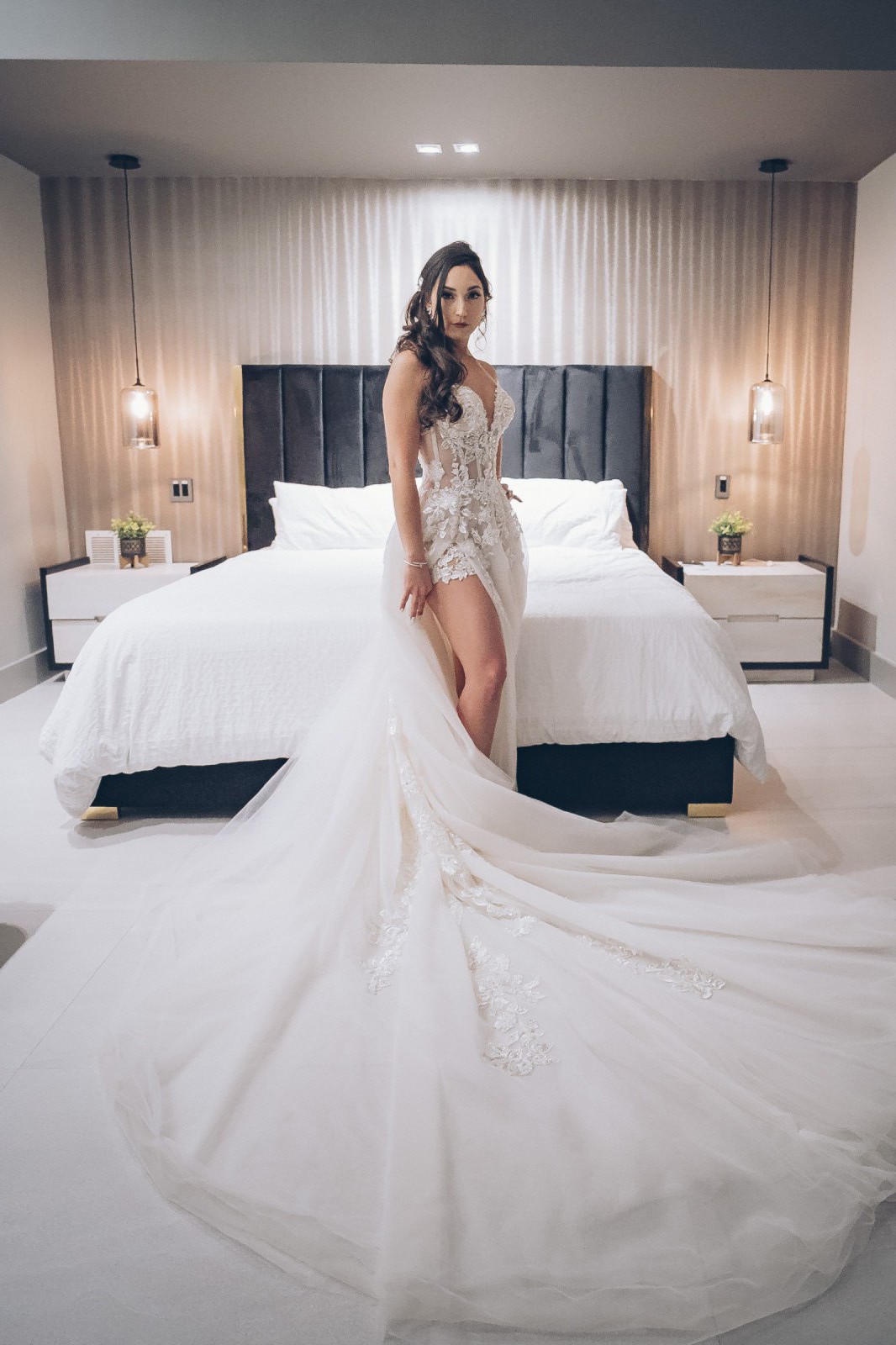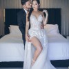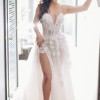 - A daring leg slit unveils a delicately crafted bodysuit, adorned with original one-of-a-kind Galia Lahav appliqué work, adding a touch of romance and intrigue to the gown