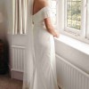 An off the shoulder, 'Harbour Frill' dress crafted by the luxury British designer Kate Halfpenny at Halfpenny London.