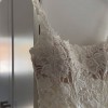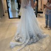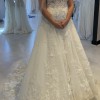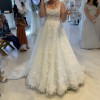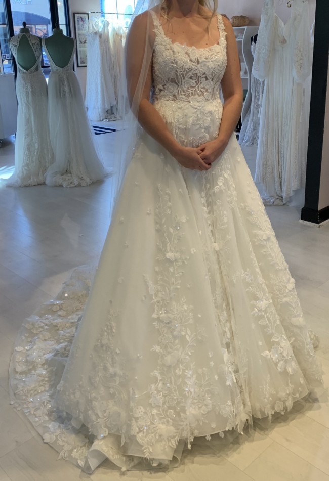 Beautiful laced flowers all over that lead onto the train. There are sequins and beading all over the dress that make it shimmer in the light. Its a full dress, but not to heavy. You could easily wear it for your entire wedding day and be comfortable. It’s truly a beautiful dress that would made your wedding day so special!