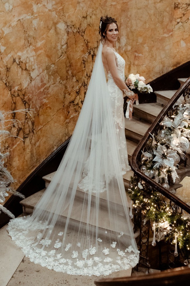 My beautiful Galia Lahav wedding dress was brought from Browns Bride's in London, the material is a semi-sheer silk tulle with elegant sparkle and textured beaded florals. This dress looks beautiful in the photos, but it’s even more stunning in real life and everything I had imagined my dream Galia gown looking - Glamorous and elegant with the long sleeves, yet fitted and sexy with a low back, plunging neckline, and of course the sparkles! When the light hits this dress it really does give the wow factor! The shine and sparkle was the main reason I fell in love with this dress for my twilight christmas wedding, it couldn’t have been more fitting for the day and I felt beautiful wearing it.