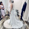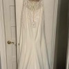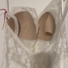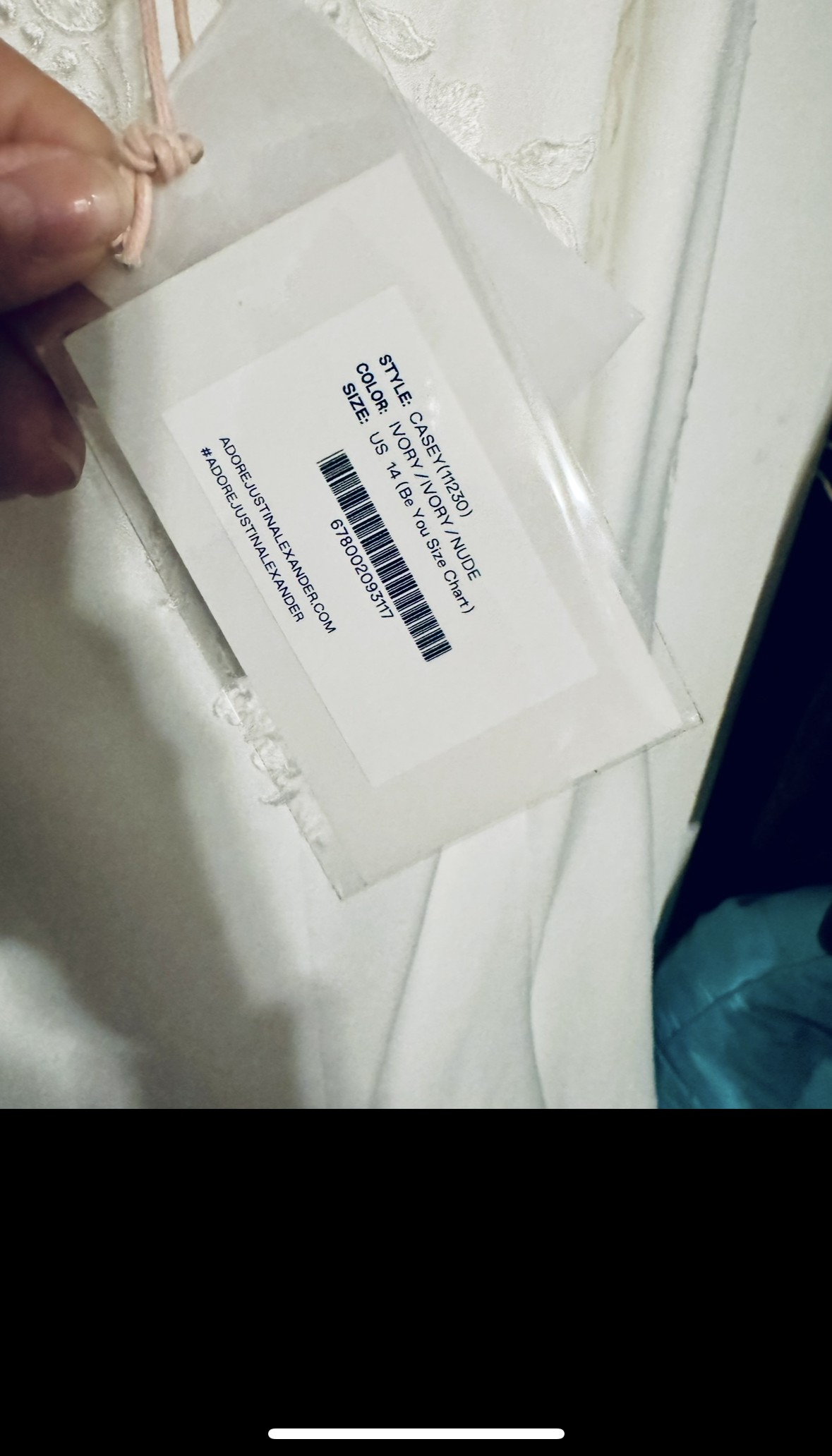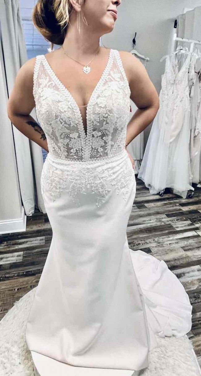 New from bridal shop with tags. No alterations. Dress is Size 14. In these pictures I was a size 6/8 in street size and was going to need alterations. No stains, rips, or tears. Beautiful and comfortable dress, just found something that fits my vision better!