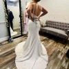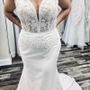 This crepe fit and flare wedding dress is a gown you can't resist. With a sexy illusion bodice, it features a tasteful plunging V-neckline with an open square back, while a soft point d'esprit underlay adds subtle detail. Lace trim outlines the neckline and