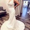 waist, and perfectly blends with sequined lace appliqués. The appliqués trickle onto the clean skirt allowing you to show off your curves. The style is finished with a stretchy jersey lining and a chapel length train.