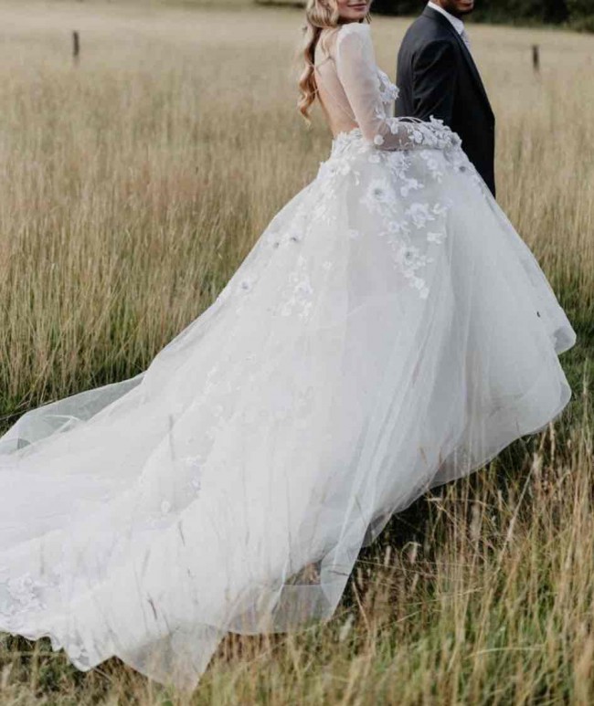 The wedding dress has been worn once and professionally dry-cleaned ahead of finding her new home