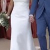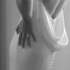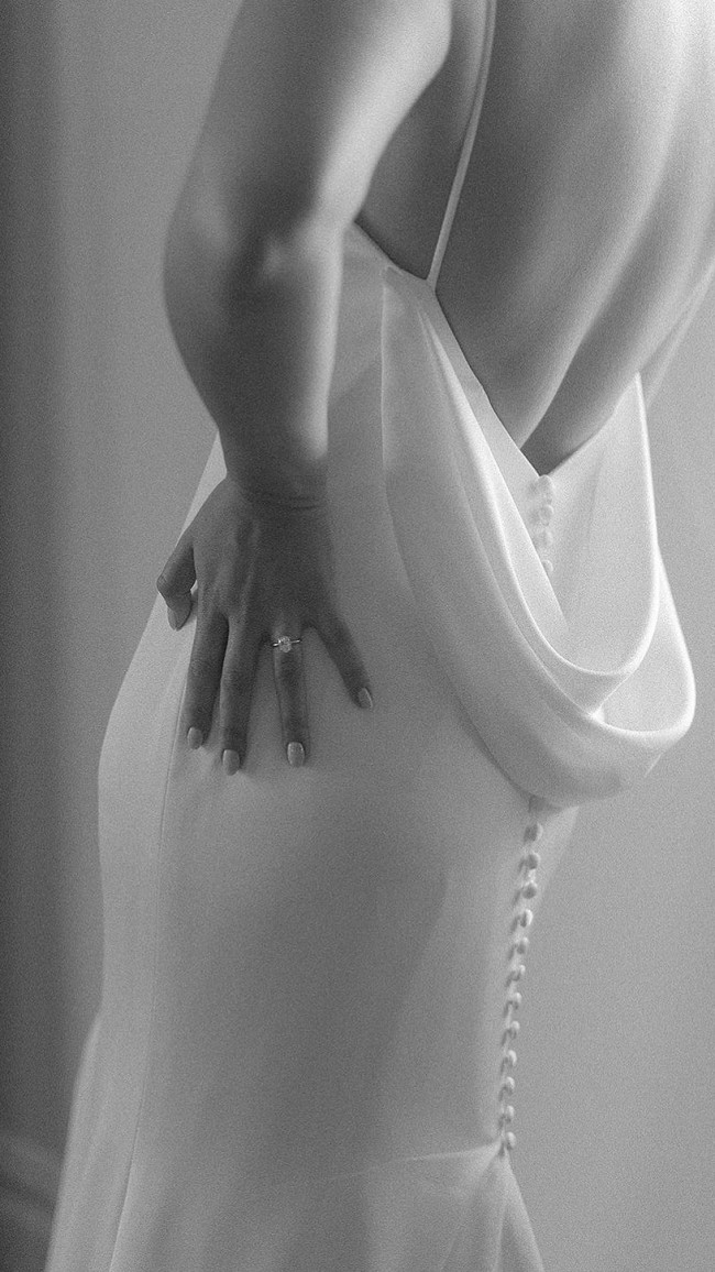 Bateau neck low back stretch satin siren gown with removable cowl draped back in ivory.