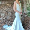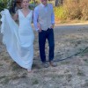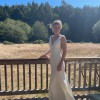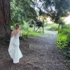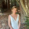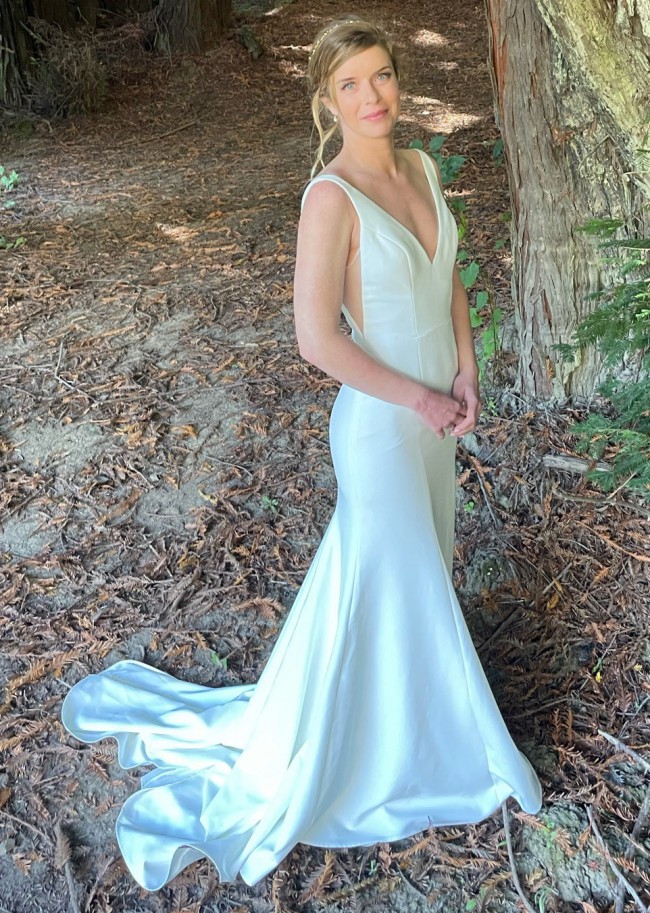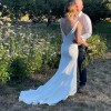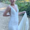 Beautifully simple and elegant dress with unique small details like buttons down the back, the windows on side ribs, etc….I wore it to our farm wedding and it worked nicely - could also be just right for a more formal wedding. Dry cleaned immediately after wedding. A few very small stains remain at bottom of dress - wouldn’t be noticeable in person unless someone was REALLY looking and wouldn’t show up in photos (I got it dirty before we took any photos haha and it’s a lot cleaner now). One pear button embellishment missing off the back - imagine that’s a very easy and cheap fix. I had so much fun dancing in this dress as it moves with you and absolutely loved spending my afternoon, evening and late night in it — super versatile and amazingly flattering.