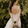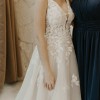 Organic shapes feature distinct leaf shapes as opposed to traditional floral detailing for a uniquely modern update, as they gently cascade over the sheer bodice with plunging neckline. Falling at varying lengths over the natural waistline and onto the skirt of layered glitter tulle and Regency organza, these details truly shine throughout this whimsical yet elevated design. A clean V-back detail is created with sheer panels covered in leaf detailing for a head-turning statement, while the back of the skirt flows out into a lush, frothy train.
