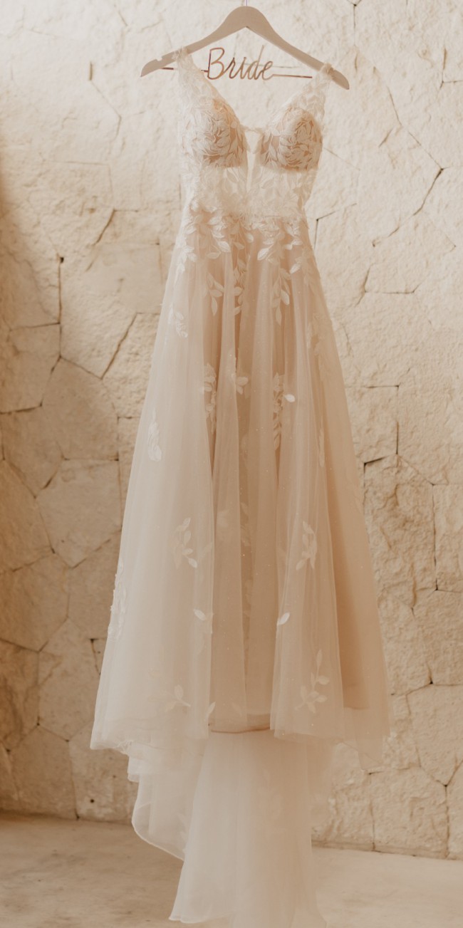 This dress is absolutely beautiful. The dress is ivory lace with glitter tulle. The tulle shimmers in the night light and adds beautiful dimension for a romantic first dance under the night light.