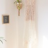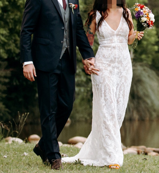 Now, let's talk about post-celebration care. This dress has been treated with the utmost respect, making a swift visit to the dry cleaner just days after the wedding. While the lace may have embraced a charming ivory hue over time, and a subtle discolouration near the lower edge hints at a memorable encounter with some celebratory wine, it all adds to the character of this extraordinary gown.