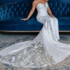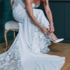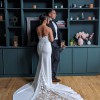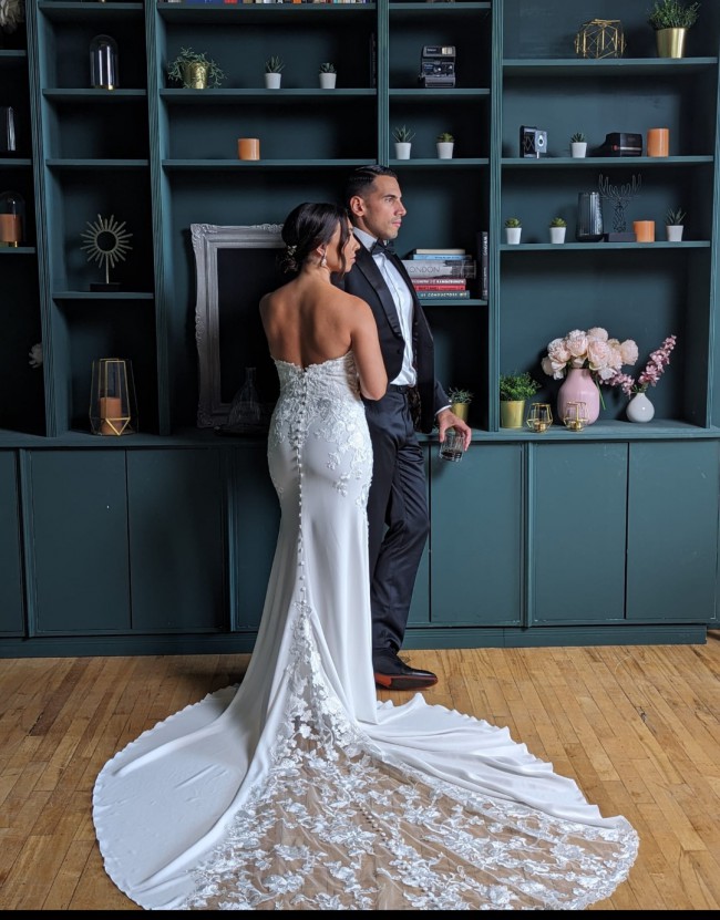 Gorgeous wedding dress with a long spectacular lace train, giving a beautiful silhouette. An elegant and classy piece designed to play up the most absolute femininity.
