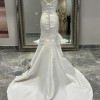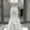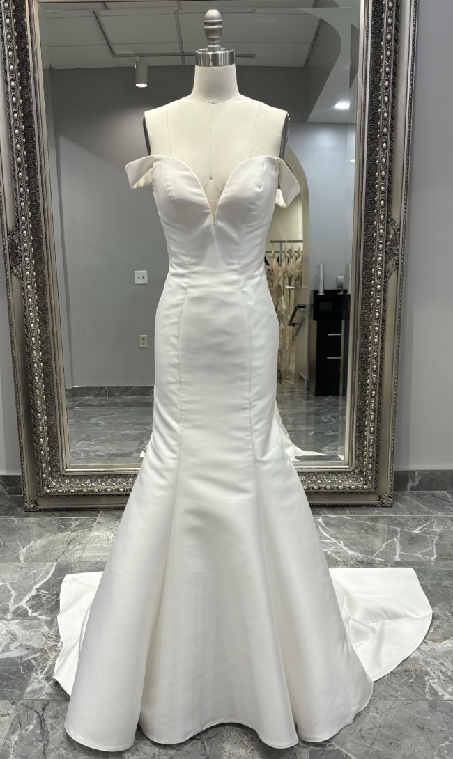 The ease of this simple off-the-shoulder wedding gown from Essense of Australia is what makes it so glamorous and gorgeous - perfect for the classic bride. A plunging sweetheart neckline, reminiscent of an old-Hollywood style, extends effortlessly into off-the-shoulder sleeves, creating a look that highlights your face beautifully. From the bodice, this structured Mikado gown extends through the hips before flaring out into a full skirt. Visible, curved seaming highlights the gown, creating an enviable hourglass shape. A slight V adorns the back of this gown and is accented with buttons that run the length of the skirt and train. The back of this simple off-the-shoulder wedding gown zips up beneath fabric-covered buttons