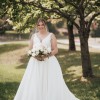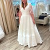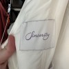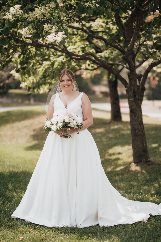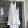 This on trend mikado ball gown is everything and more. It has an asymmetric draped V-neckline that leads to a natural waistline and pockets. Buttons to the end of the chapel length train complete the look. I loved this dress so much, and it was the absolute best feeling of confidence on the best day. Sewn in cups, and a bustle were alterations that were done. The dress was dry cleaned and pressed 2 weeks after the wedding. If I were to get married again, I would choose this dress over and over. It also has pockets which is a major plus!