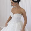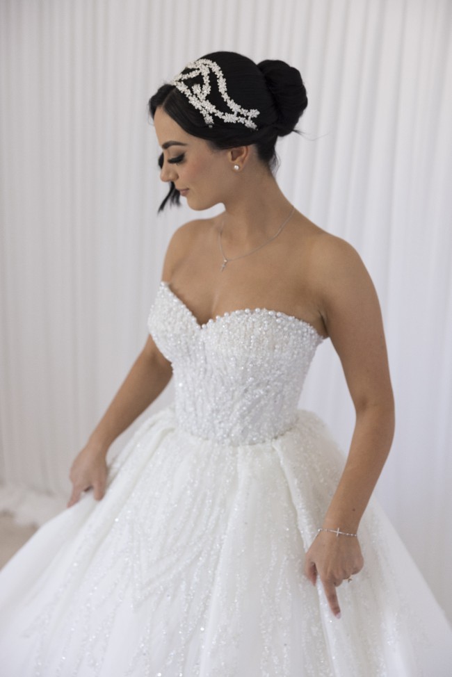 This stunning wedding dress boasts intricate beading and pearl detailing that gracefully cascades down the bodice, creating a dreamy and ethereal look. The ballgown silhouette flatters the figure, and the delicate sweetheart neckline adds a touch of romance, with a regal 2.5m train.