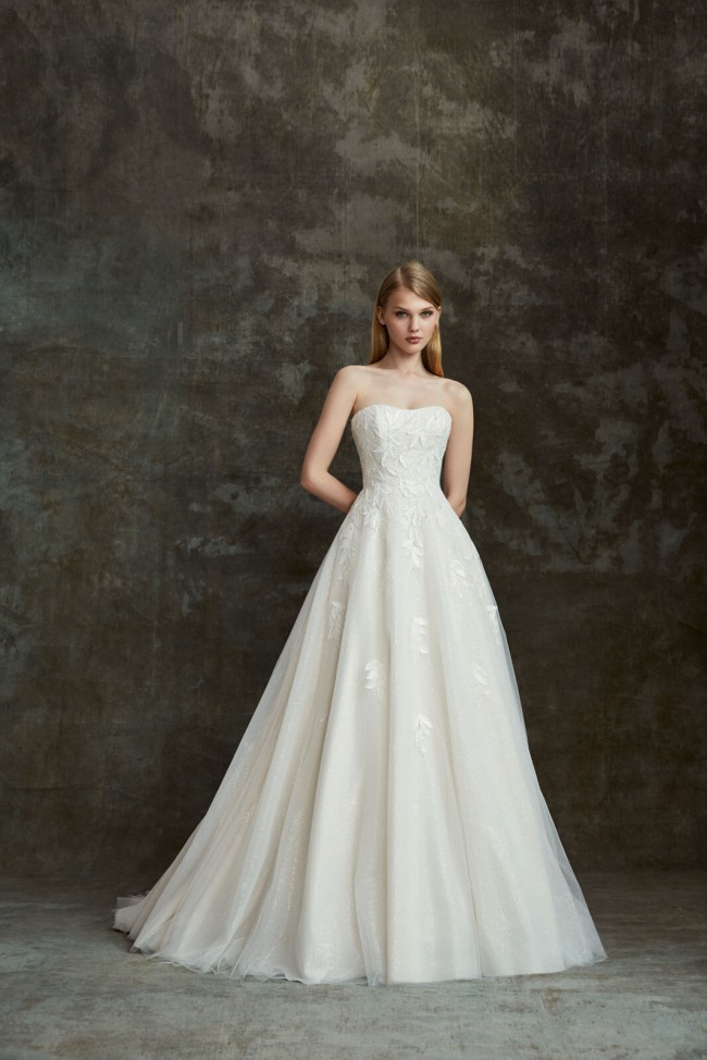 A line foliage appliqué dress with sequin detail and gentle sparkle throughout