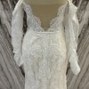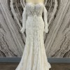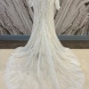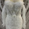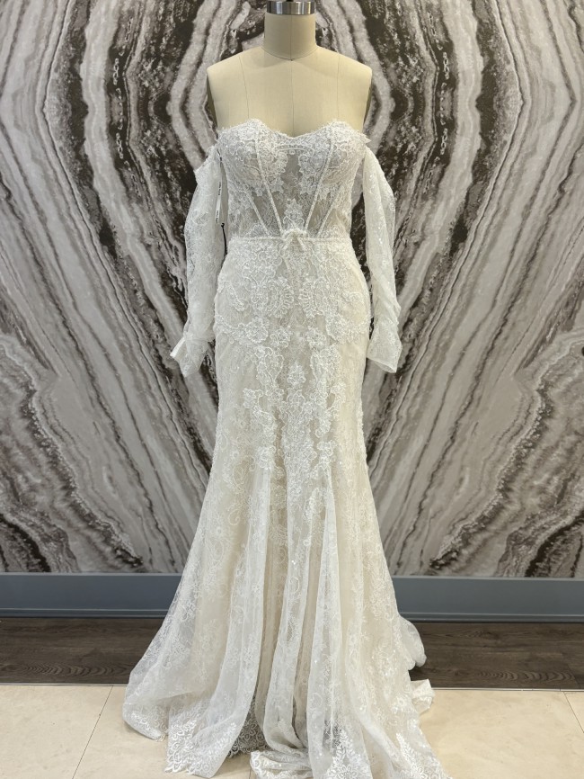 A mermaid off-the-shoulders ivory gown with an open back. Floral embroidery adorns the gown from the semi-transparent delicate striped top to the tulle skirt with a long train. Comes with matching detachable sleeves.