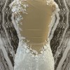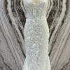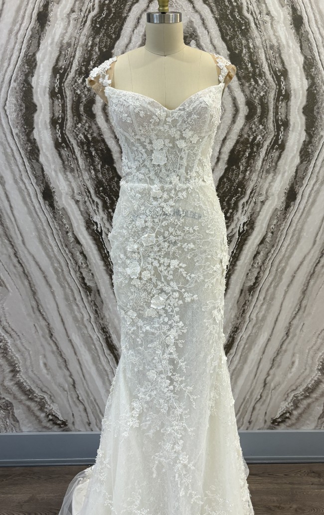 Stunning lace fit and flare gown by designer Mistrelli. Gown is adorned with floral lace embroidery with a sexy low back moment. Has cap sleeves and a sweetheart neckline to flatter the body.
