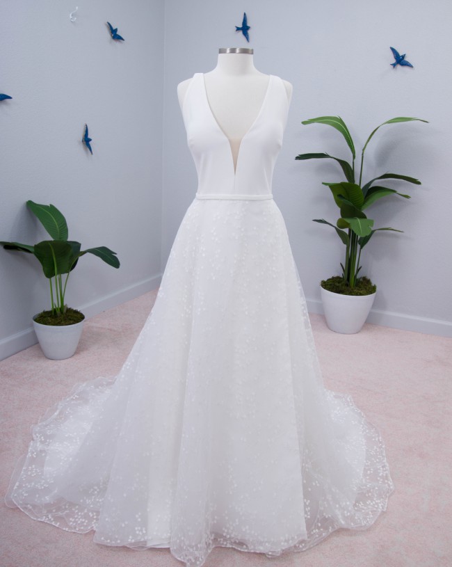 DearlyBelovedBridal.com sells authentic designer wedding gowns up to 70% off retail. All of our dresses are either new or bridal boutique samples that have been tried on but never worn at a wedding.