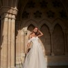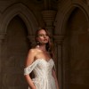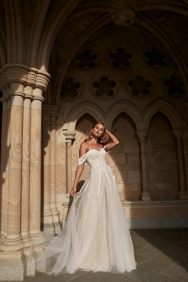 “Soft, ethereal and romantic, Zyla has it all. Blending modern bold lace with her classic Aline design in perfect harmony. Featuring a strapless sweetheart neckline bodice with detachable off-shoulder straps that add an extra element of femininity and allow for two different bridal looks. Zyla is equally stunning from the back with vertical lace placement flowing down to a 30” illusion train.”
