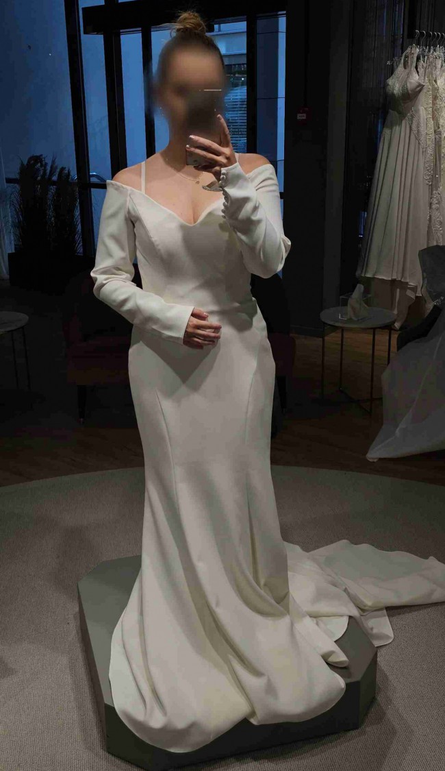 I initially was captivated by its minimalist charm, I envisioned this dress as the epitome of effortless beauty for my special day. However, I recently stumbled upon another gown that resonates with me on a deeper level. Therefore, I never wore this dress anywhere bar, just trying it on! So it's completely new.