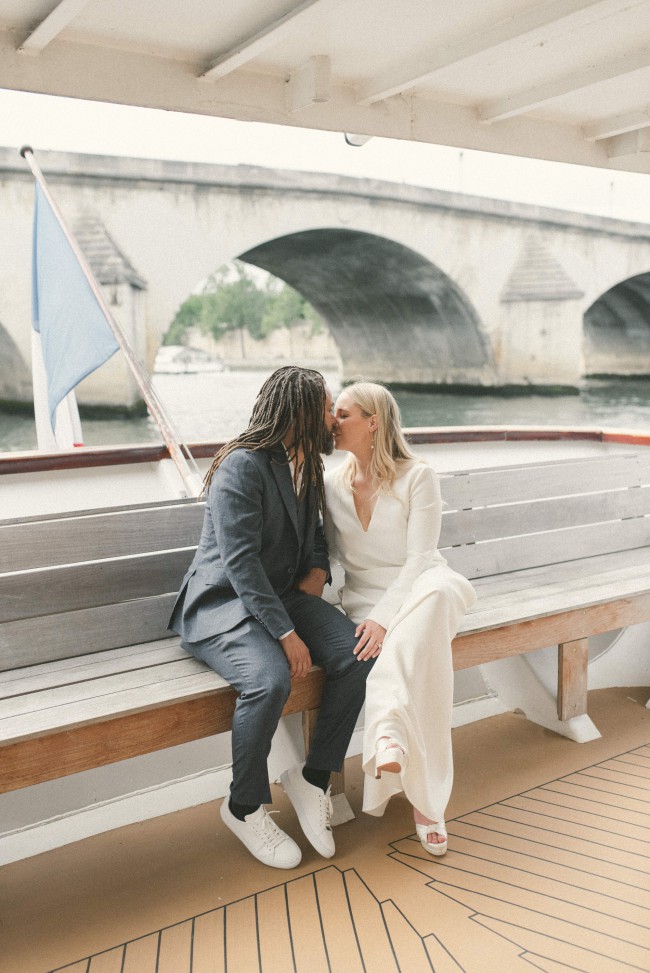 Safiyaa’s demi-couture collections are defined by clean lines and feminine tailoring, which suits the modern bride perfectly. Made from crepe, this 'Aleah; gown champions minimalism with its sweeping silhouette and V-neckline. The silk-blend satin scarf can be draped over the shoulders or wrapped around the neck.