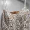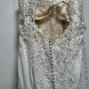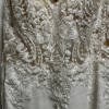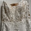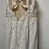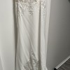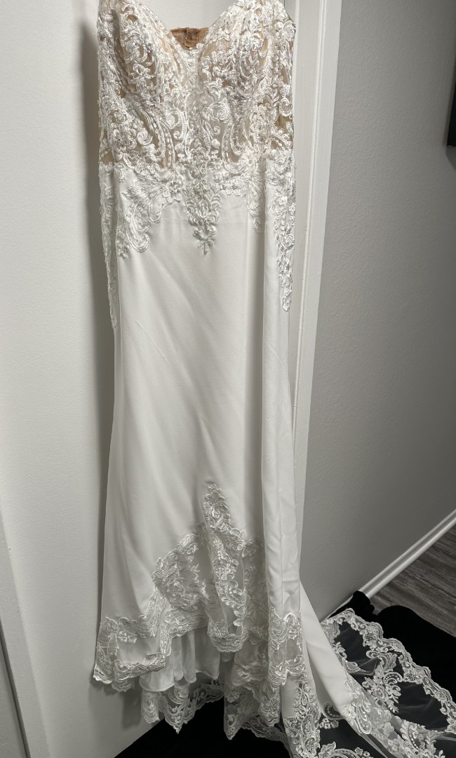 The wedding dress was for my daughter’s wedding. It was purchased at David’s Bridal. The dress has never been worn with the exception of trying on. It was in the process of minor alterations in 2020 (she wanted to add a lace draped off the shoulder style straps for added bust support) but due to Covid the wedding was postponed. My daughter is now getting married in a couple months, but the dress does not fit due to having two children since then. The alterations were never completed. The draped style off the shoulder sleeves were never added; only the spaghetti straps were added (which I believe the draped sleeves were going to be added off the spaghetti straps) The dress was originally sleeveless. The spaghetti straps can be easily removed if strapless is preferred. I have more pictures if you would like to see what it looks like on. The dress is soft white and sheer in the mid belly area, chapel train, back zipper, mesh lined bodice, and fully lined skirt. It’s a very beautiful dress. In fact, this dress had just come in the David’s Bridal store the same day we went dress shopping. It had barely been put on the mannequin when we got to the store.