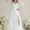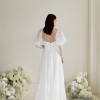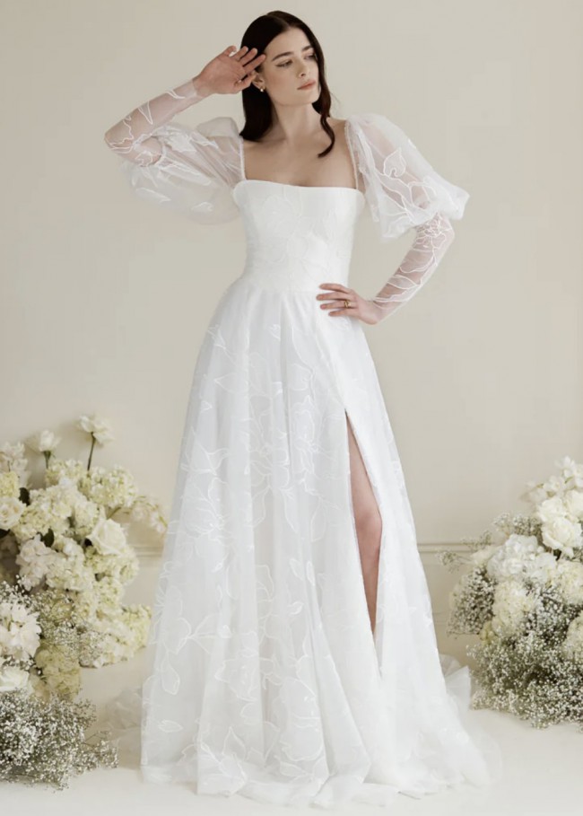“Simone was designed for the romantics among us. With a full circle skirt and thigh-high slit, and finished with a