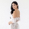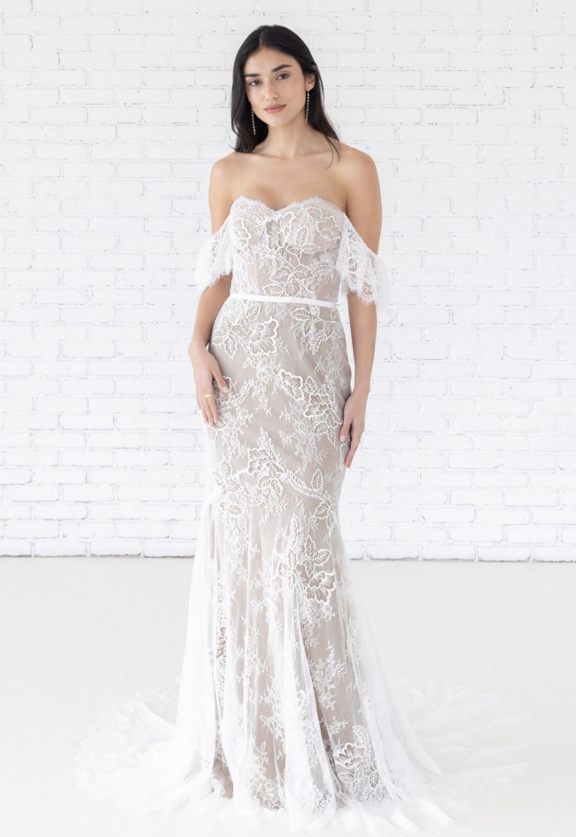 A gown of Maryann Chantilly Lace from head to toe, the Mila gown pairs floral dimension with soft flutter sleeves and exposed corsetry details.
